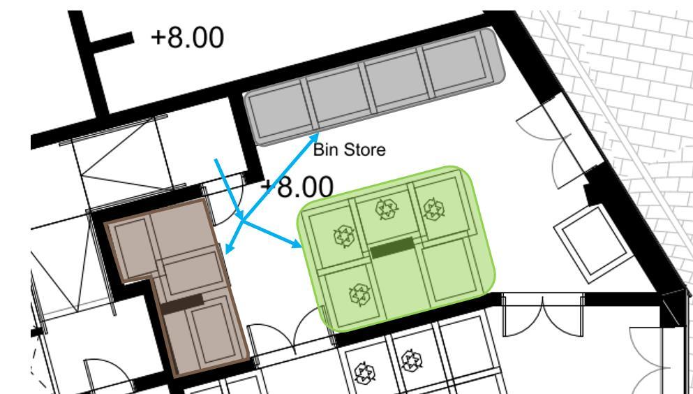 [type of solution] will be located in easy to reach areas, and will contain sufficient space to allow the separate storage of [delete as appropriate food waste, dry recyclables (including paper, glass, metal, plastic and card) and residual waste]. (Include if relevant) [Similar practices will be employed within the commercial land uses.]