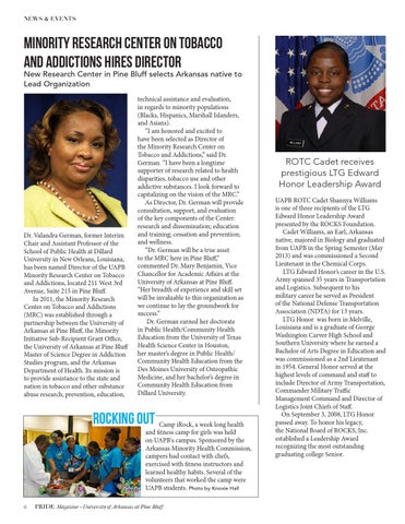 technical assistance and evaluation, in regards to minority populations (Blacks, Hispanics, Marshall Islanders, and Asians). “I am honored and excited to have been selected as Director of the Minority Research Center on Tobacco and Addictions,” said Dr. German. “I have been a longtime supporter of research related to health disparities, tobacco use and other addictive substances. I look forward to capitalizing on the vision of the MRC.” As Director, Dr. German will provide consultation, support, and evaluation of the key components of the Center: research and dissemination; education and training; cessation and prevention; and wellness. “Dr. German will be a true asset to the MRC here in Pine Bluff,” commented Dr. Mary Benjamin, Vice Chancellor for Academic Affairs at the University of Arkansas at Pine Bluff. “Her breadth of experience and skill set will be invaluable to this organization as we continue to lay the groundwork for success.” Dr. German earned her doctorate in Public Health/Community Health Education from the University of Texas Health Science Center in Houston, her master’s degree in Public Health/ Community Health Education from the Des Moines University of Osteopathic Medicine, and her bachelor’s degree in Community Health Education from Dillard University.