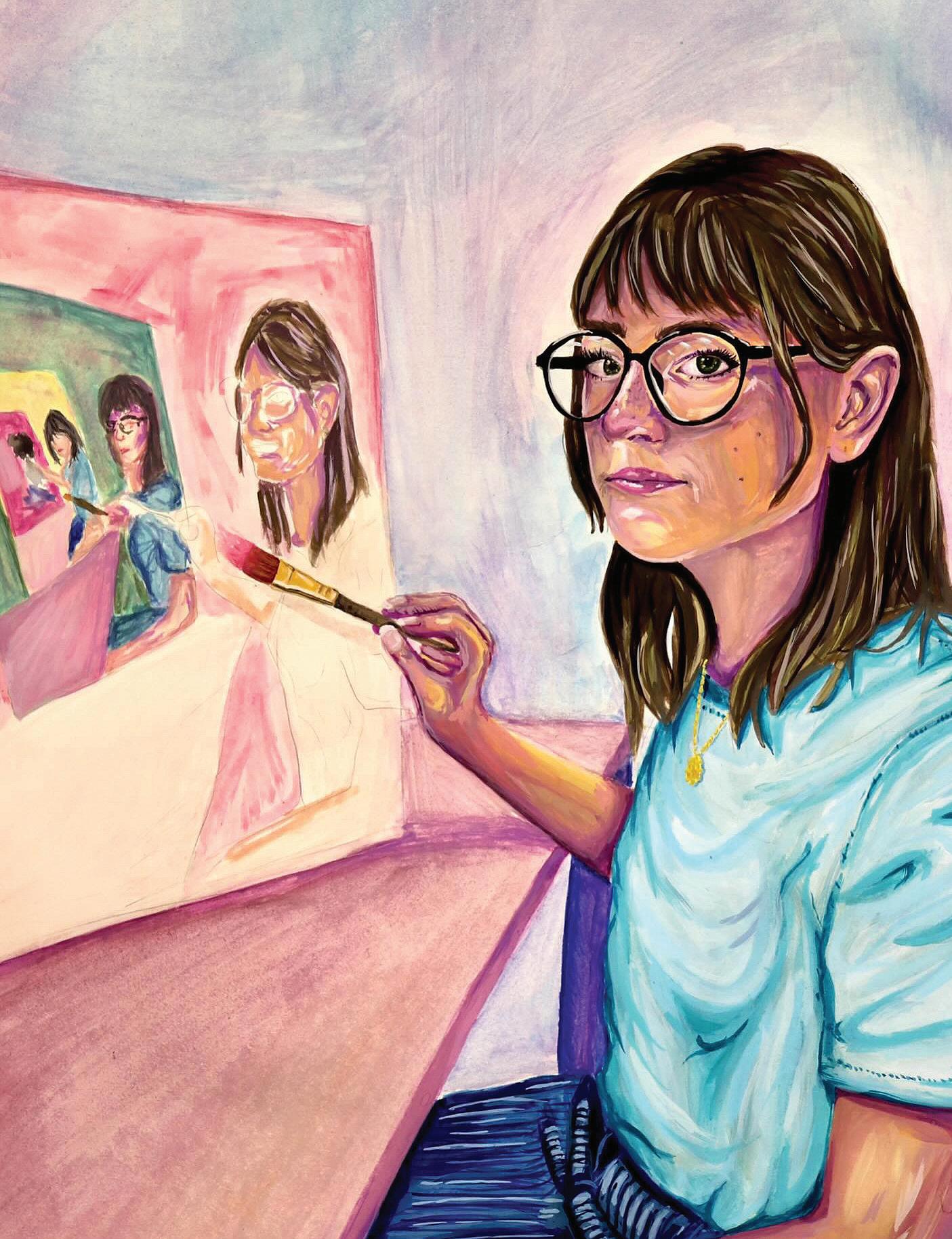 Abbie Ahlbrandt, a University of Arkansas art student, begins a new painting, backdropped by her painting “Self-Portrait 2.” Ahlbrandt often uses her vivid dreams as inspiration while creating.