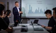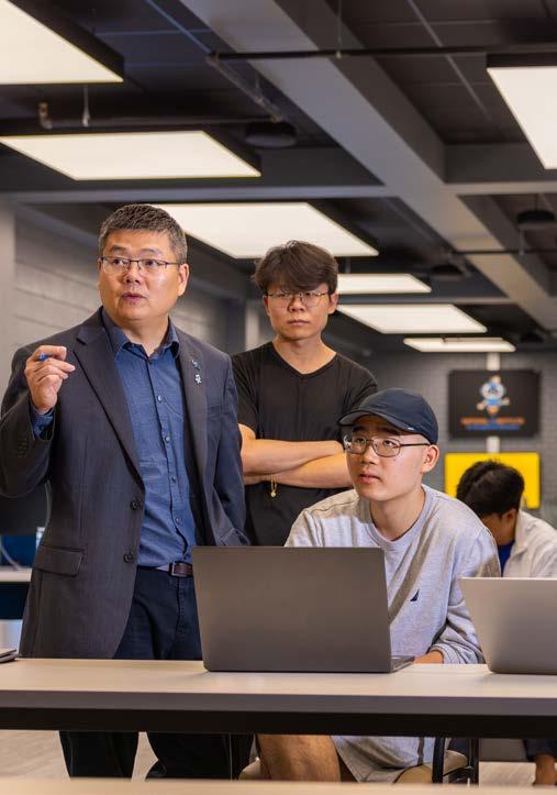 At Right: Jinjun Xiong, PhD, director, Institute for Artificial Intelligence and Data Science and SUNY Empire Innovation Professor in the Department of Computer Science and Engineering, School of Engineering and Applied Sciences, collaborating with students.