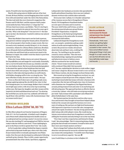 Latham talk to her husband, an investor who specialized in health and wellness franchises. Kern was sure Latham’s dynamic workout style could be taken nationally. Seven years later, Latham, 61, is founder and partner of the runaway success that is Orangetheory Fitness. Nearly 750 Orangetheory-franchised studios are now open in 46 states and 16 countries. This year, both Forbes and Fortune, as well as E LLE N L A TH AM the entrepreneurial-advocacy group Women How do you think the Presidents’ Organization, recognized environment for female Orangetheory as the fastest-growing femaleentrepreneurs has changed owned business in the nation after its annual in the past five years? revenues hit $450 million. Dramatically. I think more Latham developed the Orangetheory workwomen are getting higher out—an energetic, metabolism-spiking combieducation and want to be nation of cardio and strength-building—from successful in their careers. You scratch. She pored over studies old and new have some brilliant women about intervals and heart rates, crediting UB, doing great things in tech even she says, “for instilling in me the need for though it’s a man’s world. You research, science and data.” Then she went can see that still exists, but we beyond physiology, tapping into psychology have definitely made leaps and behavioral science to fashion a more and bounds. effective workout for her mostly female clients. “I knew women would not continue with a workout if they didn’t feel successful at it,” she says, explaining her decision to create walker, jogger and runner categories. Because women tend to crave variety in their fitness routines, she also changes workout themes daily. Men wound up loving the Orangetheory workout, too, and now compose around 40 percent of the company’s clients. A marketing truism holds that women will enter a business with a masculine vibe, but men will largely steer clear of a business with a feminine one. Orangetheory has flipped that theory around, putting women front and center in its marketing and still attracting men. The approach has been so effective that on a recent day, Latham—who still leads several group workouts per week—had a woman with a pacemaker and a Miami Dolphins football player in the same class. Her business partner Jerome Kern and two other executives and investors they brought on board have helped Latham build out the concept and expand the business over seven years of scaling up. Her partners are high-level businessmen with impressive experience in areas like sales, management and private-equity investment—but also strong opinions that didn’t always jibe with Latham’s vision. She recalls having intense conversations about how Orangetheory would be run, stifling her frustration and only letting it out on the way home. “Over time I saw they respected me and listened to things I said,” she acknowledges. “But it is interesting being a female going into that all-male environment. It would’ve been nice if there were more female mentors out there.” How to change that? Latham cheerfully ends an interview about her entrepreneurial success by volunteering to mentor any women who need guidance. “I would be more than happy to serve in an advisory capacity,” she says. Lynn Freehill-Maye is a freelance writer in Buffalo, N.Y.