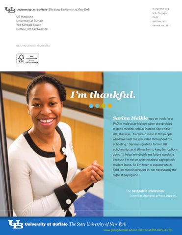 I’m thankful. Sarina Meikle was on track for a PhD in molecular biology when she decided to go to medical school instead. She chose UB, she says, “to remain close to the people who have kept me grounded throughout my schooling.” Sarina is grateful for her UB scholarship, as it allows her to keep her options open. “It helps me decide my future specialty because I’m not as worried about paying back student loans. So I’m freer to explore which field I’m most interested in, not necessarily the highest paying one.”