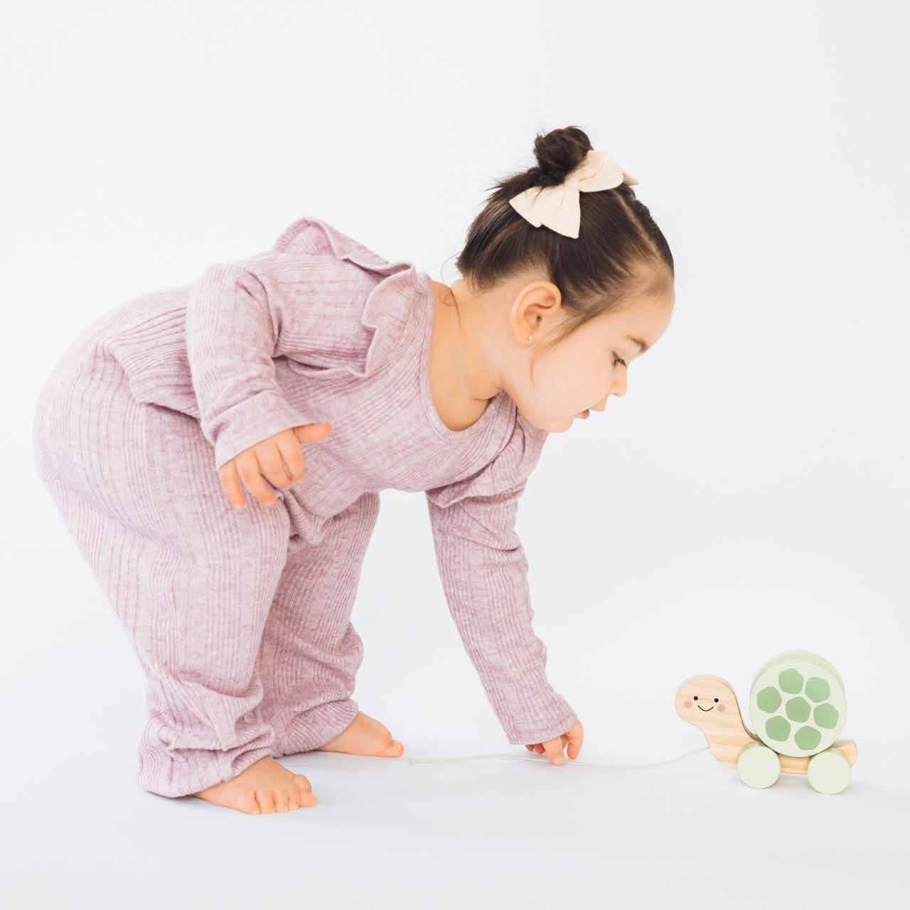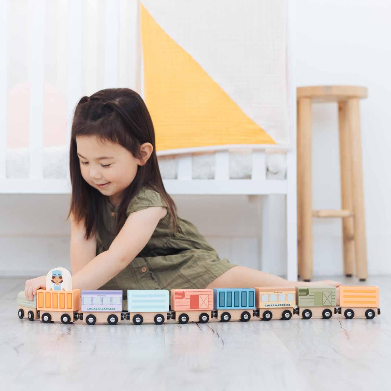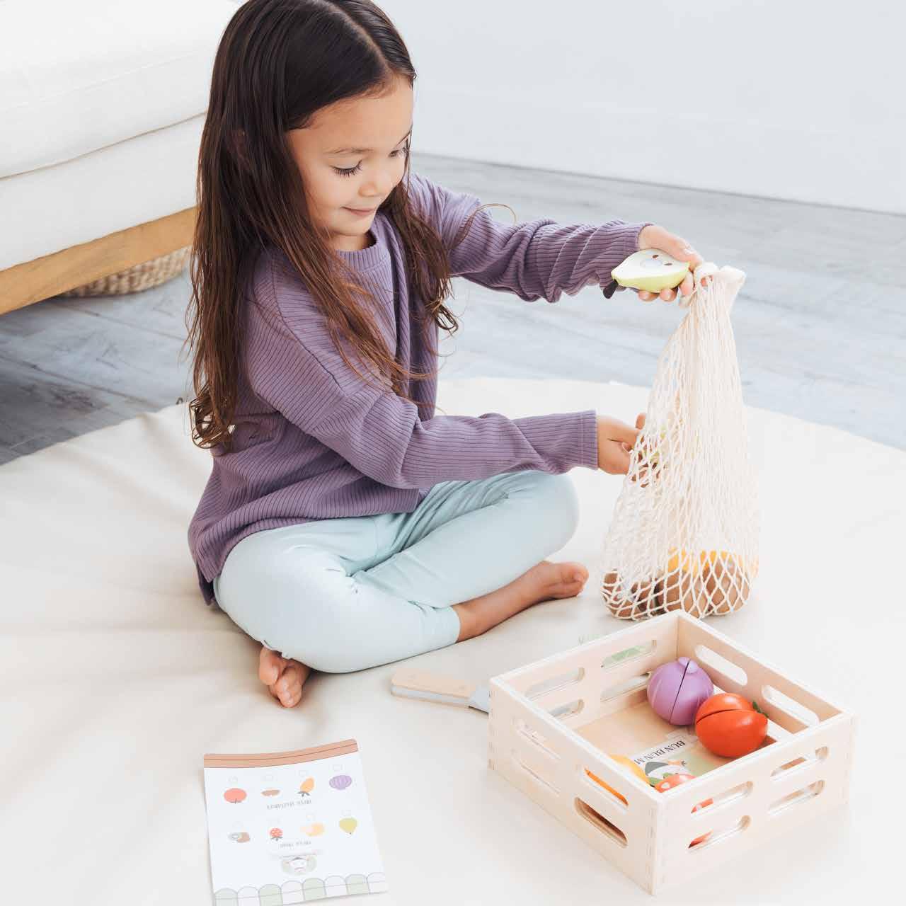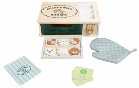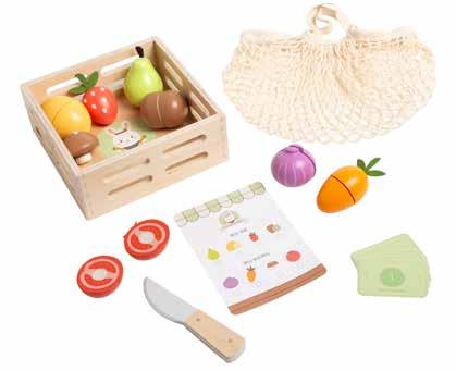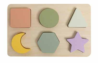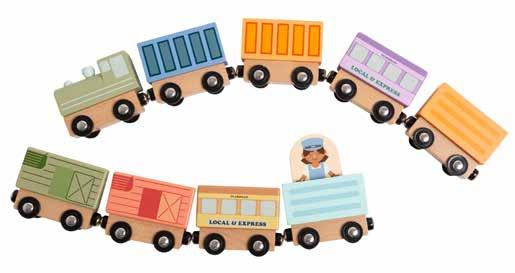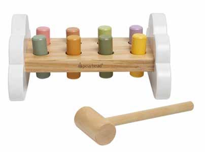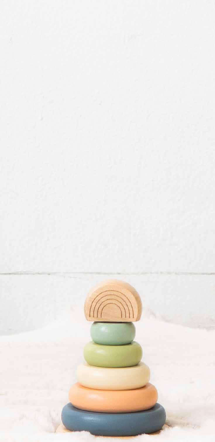 Includes 5 wooden pieces to stack and build a rainbow! 12m+