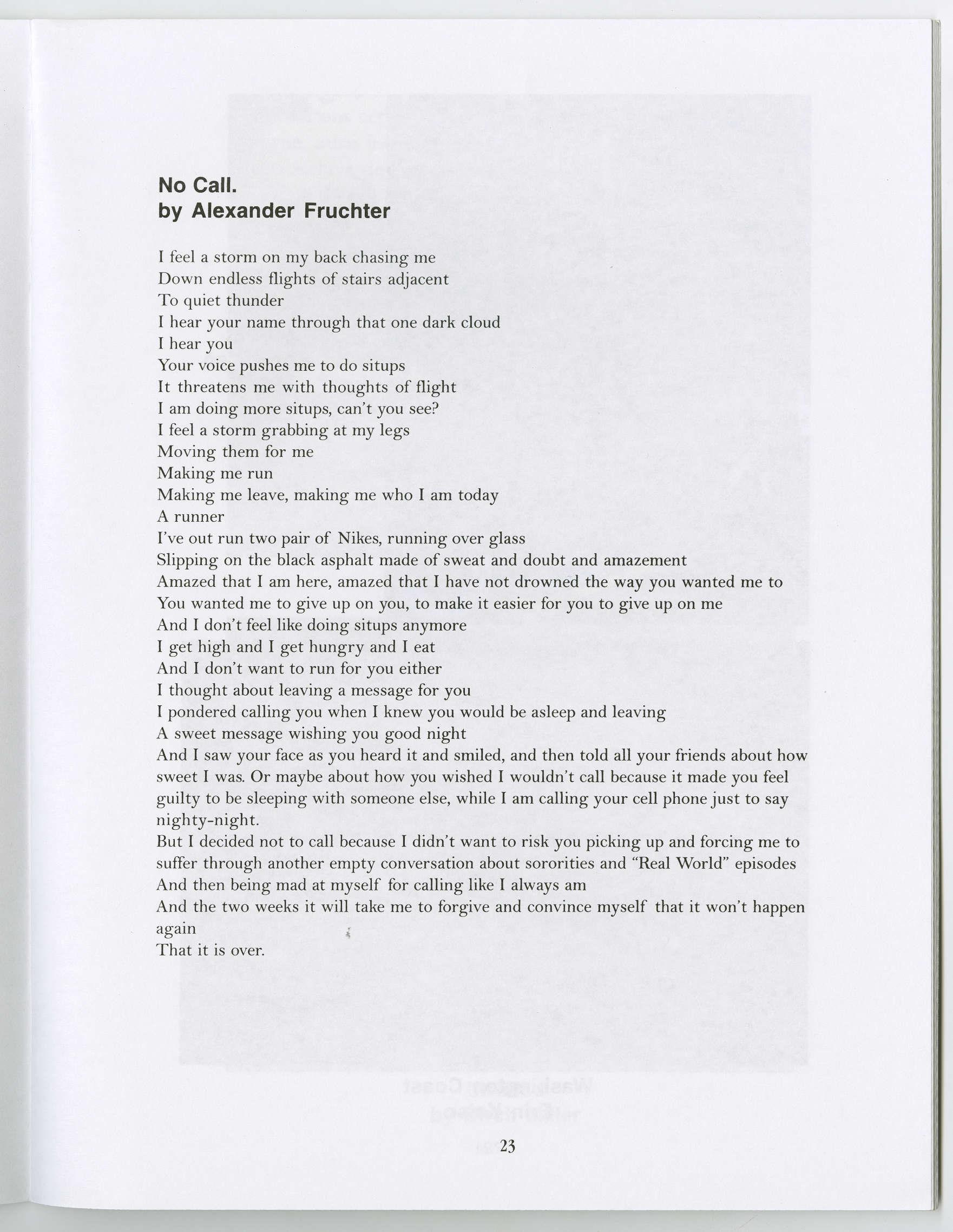 I feel a storm on my back chasing me Down endless flights of stairs adjacent To quiet thunder I hear your name through that one dark cloud I hear you Your voice pushes me to do situps It threatens me with thoughts of flight I am doing more situps, can't you see? I feel a storm grabbing at my legs Moving them for me Making me run Making me leave, making me who I am today A runner I've out run two pair of Nikes, running over glass Slipping on the black asphalt made of sweat and doubt and amazement Amazed that I am here, amazed that I have not drowned the way you wanted me to You wanted me to give up on you, to make it easier for you to give up on me And I don't feel like doing situps anymore I get high and I get hungry and I eat And I don't want to run for you either I thought about leaving a message for you I pondered calling you when I knew you would be asleep and leaving A sweet message wishing you good night And I saw your face as you heard it and smiled, and then told all your friends about how sweet I was. Or maybe about how you wished I wouldn't call because it made you feel guilty to be sleeping with someone else, while I am calling your cell phone just to say nighty-night. But I decided not to call because I didn't want to risk you picking up and forcing me to suffer through another empty conversation about sororities and "Real World" episodes And then being mad at myself for calling like I always am And the two weeks it will take me to forgive and convince myself that it won't happen again That it is over.