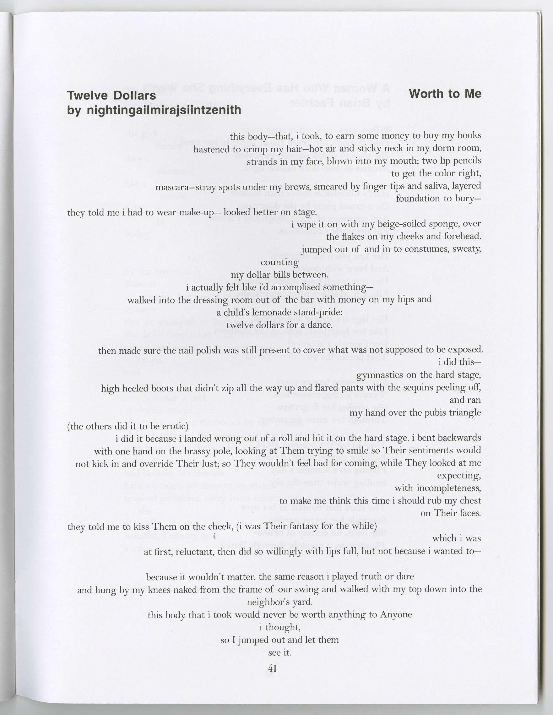 counting my dollar bills between. i actually felt like i'd accomplised somethingwalked into the dressing room out of the bar with money on my hips and a child's lemonade stand-pride: twelve dollars for a dance.