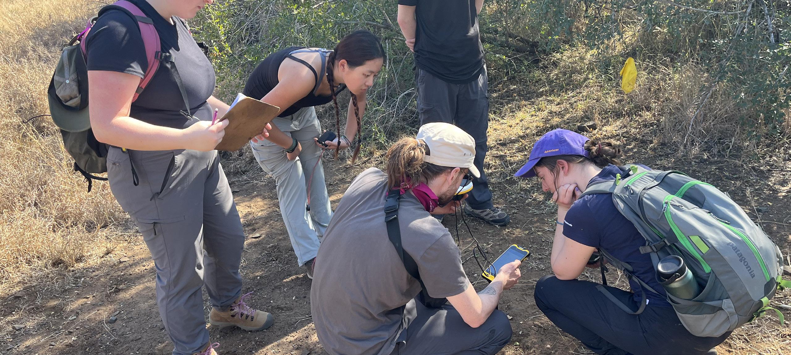 Students enrolled in the Communities, Wildlife and Conservation in Post-Apartheid South Africa program use handheld instruments from UBC Forestry’s Trimble Technology Lab to sample and measure plants within a 25-metre-radius plot at Kruger National Park.