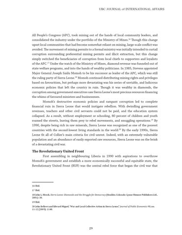 All People’s Congress (APC), took mining out of the hands of local community leaders, and consolidated the industry under the portfolio of the Ministry of Mines.16 Though this change upset local communities that had become somewhat reliant on mining, large-scale conflict was avoided. The movement of mining permits to a formal ministry was initially intended to curtail corruption surrounding preferential mining permits and illicit extraction, but this change simply switched the beneficiaries of corruption from local chiefs to supporters and loyalists of the APC.17 Under the watch of the Ministry of Mines, diamond revenue was funneled out of state welfare programs, and into the hands of wealthy politicians. In 1985, Stevens appointed Major General Joseph Saidu Momoh to be his successor as leader of the APC, which was still the ruling party of Sierra Leone.18 Momoh continued distributing mining rights and privileges based on favouritism, but perhaps more devastating was his series of unviable, and ludicrous economic policies that left the country in ruin. Though it was wealthy in diamonds, the corruption among government executives saw Sierra Leone’s most precious resources financing the whims of favoured ministers and businessmen. Momoh’s destructive economic policies and rampant corruption led to complete financial ruin in Sierra Leone that would instigate rebellion. With dwindling government revenues, teachers and other civil servants could not be paid, and the education system collapsed. As a result, without employment or schooling, 80 percent of children and youth roamed the streets, leaving them prey to rebel movements, and smuggling operations.19 By 1990, despite being rich in raw minerals, Sierra Leone was recognized as one of the poorest countries with the second-lowest living standards in the world.20 By the early 1990s, Sierra Leone fit all of Collier’s main criteria for civil unrest. Indeed, with an extremely vulnerable population and an abundance of easily exported raw resources, Sierra Leone was on the brink of a devastating civil war.