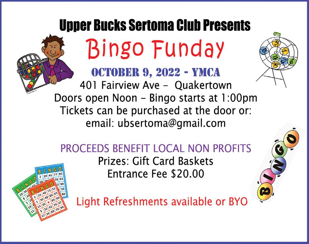 UB Sertoma Club presents Bingo Funday (opens noon) at UBYMCA, 401 Fairview Ave, Quakertown. Games at 1pm. Tkts at door or ubsertoma@gmail.com or 610-360-0521. $20. Refreshments available or BYO. (no alcohol)