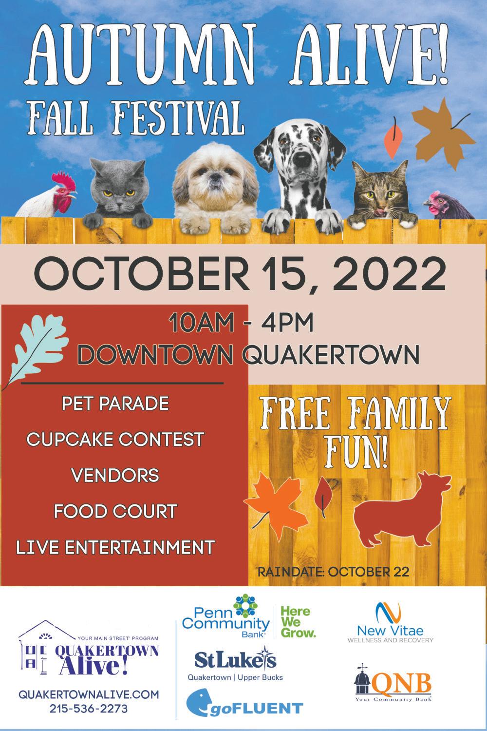 Autumn Alive! Fall Festival, 10am-4pm in Downtown Quakertown. Free Family Fun, Pet Parade, Cupcake Contest, Vendors, Food Court & Live Entertainment. (Rain date Oct. 28) quakertownalive.com or 215-536-2273