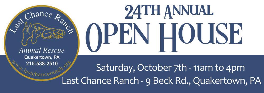 Last Chance Ranch Open House (rescheduled) 11am-4pm at 9 Beck Rd, Quakertown. Pony rides, Petting zoo, Kids games, Crafts, Vendors, Animal demos, 50/50, Basket raffles, Food trucks, Beer/Wine. Info: lastchanceranch.org