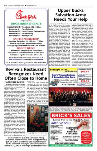 Revivals Restaurant Recognizes Need Often Close to Home The amount of need just in our local area came as a surprise to Sue Scott, as it might come to any of us. Sue is determined to do what she can to help out. Michael and Sue Scott are the owneroperators of Revivals Restaurant on Ridge Road in Perkasie. Revivals has been open for six years now, serving “American cuisine with international flavors”. Previous to Revivals, they owned and operated a restaurant in Green Lane for 17 years. When she realized that there are so many people in this area that need a helping hand this holiday season, Sue started thinking about what she could do to help. She knew that she wanted to keep it local and that the platform of the restaurant would help publicize the effort. As Sue explains, “This is not going to pay someone’s salary, not going out of the area; this is to help those in need in Upper Bucks.” Revivals’ Community Giveback has three branches: An Angel Tree. People can choose a paper angel from the tree to make a disadvantaged child’s Christmas more merry. Written on the backs of the paper angels are the age and gender of a child along with his or her wish list for Christmas. Bring the wrapped gifts back to Revivals by December 16, so that they can be delivered. Food Drive. Revivals will be collecting non-perishable food items for the Quakertown Food Pantry. A box will be set up inside the restaurant for donations. The food drive may not just be for the holidays. Sue is considering future food