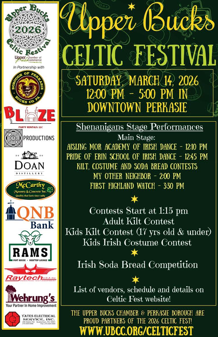 Upper Bucks Celtic Fest 12noon-5pm in Downtown Perkasie. Free! Irish dancing stage performances, Vendors, Kids’ activities, Lots of contests begin 1:15pm. More info: ubcc.org/celticfest