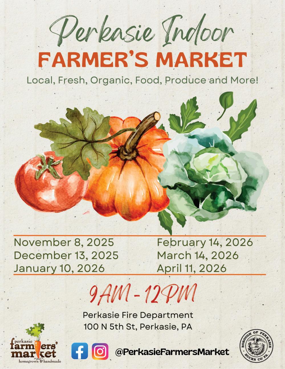 Perkasie Indoor Farmers Market 9am-12noon at Perkasie Fire Dept, 100 N Fifth St. 20+ local food vendors. 215-257-5065 ext 102.