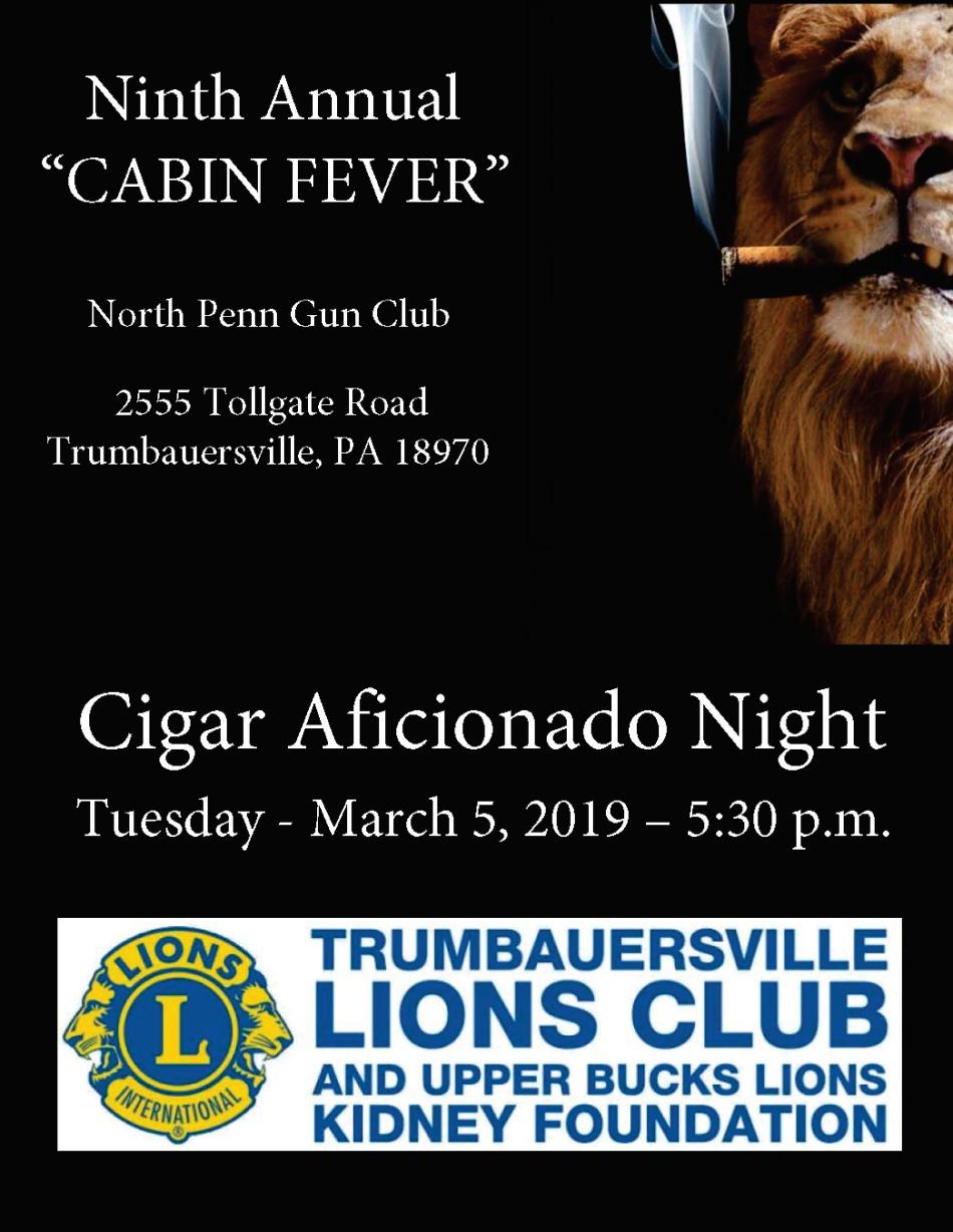 Trumbauersville Lions 16th Annual Cabin Fever Cigar Aficionado Night. 5:30 PM. North Penn Gun Club, Trumbauersville. Tickets: 215-896-6230 www.tvillelions.com See ad on next page.