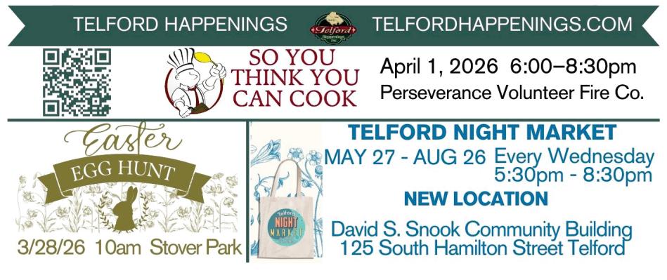 ‘So You Think You Can Cook’ culinary extravaganza, 6pm-8:30pm at Perseverance Fire Co, 266 N 2nd St, Souderton. Community comes together for fun w/ good food & friendly competition. sytycc.telfordhappenings.com
