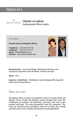 Contact Gérald Lafont and Baptiste Olivier Telephone – +33 6 64 42 87 56 Cellphone – +33 6 83 32 14 57 Email – lorhone@yahoo.com Website – www.olivier-lafont.com