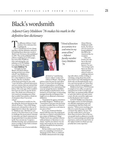 he affluenza defense. Cryptanalysis. Zero-tolerance law. Legaldygook. Law is a profession of ever-changing ideas, and the definitive reference for putting those ideas into words is Black’s Law Dictionary, first published in 1891. The newly published 10th edition, weighing in at 2,052 pages, has more than 50,000 entries, and among the contributors is SUNY Buffalo Law adjunct faculty member Gary Muldoon ’76. “I bought my first Black’s, the third edition, during my first year of law school,” says Muldoon, a partner in the Rochester, N.Y., firm Muldoon, Getz & Reston. But the vocabulary of law keeps growing, he says, with “court decisions, unusual expressions and new statutes that are enacted that use terminology that we haven’t seen before. Fifty years ago, DNA wouldn’t have been an entry in any law dictionary. The whole area of forensics is very much an emerging area of law that wouldn’t have gotten a whole lot of attention when I was in law school.” The dictionary is useful, too, for decoding the shortcuts that grease the wheels of justice. “One of the things lawyers are criticized for is the use of jargon known only to the cognoscenti,” Muldoon says. “But there’s a reason for it. You don’t have to say, ‘I want to challenge the prosecution’s attempt to introduce my client’s statement on the grounds that it was taken involuntarily.’ You can just say, ‘I request a Huntley hearing.’ Any criminal practitioner or judge in New York is instantly familiar with that.” Muldoon is one of seven individu-
