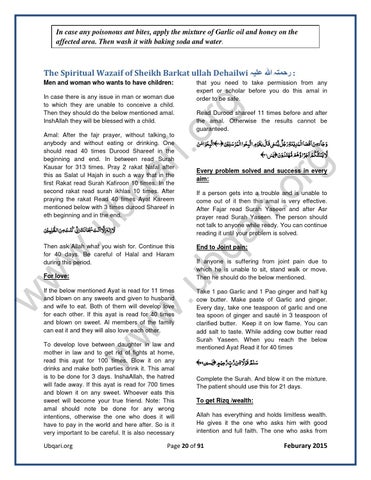 Take 1 pao Garlic and 1 Pao ginger and half kg cow butter. Make paste of Garlic and ginger. Every day, take one teaspoon of garlic and one tea spoon of ginger and sauté in 3 teaspoon of clarified butter. Keep it on low flame. You can add salt to taste. While adding cow butter read Surah Yaseen. When you reach the below mentioned Ayat Read it for 40 times ً َ ٰ َ َ ٰ ﴾۵۸ََسلماقولاماَر ٍِّاَرَحی ٍما﴿یسی Complete the Surah. And blow it on the mixture. The patient should use this for 21 days. To get Rizq /wealth: Allah has everything and holds limitless wealth. He gives it the one who asks him with good intention and full faith. The one who asks from