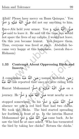 absence we saw a red bird that had two chicks. We took the chicks. The bird started spreading her feathers in front of us. In the interim Hazrat Muhammad Ă&#x2022;Ă&#x17D;Â&#x192; ð ĂŠ J Ă&#x160;ÂŤ ĂŠ<Ă&#x2039;@ Ăş Ă&#x17D;Â&#x201C; came back. As he saw the bird he at once asked, â&#x20AC;&#x2DC;Who has tormented the bird by taking her chicks? Return the chicks.â&#x20AC;&#x2122;