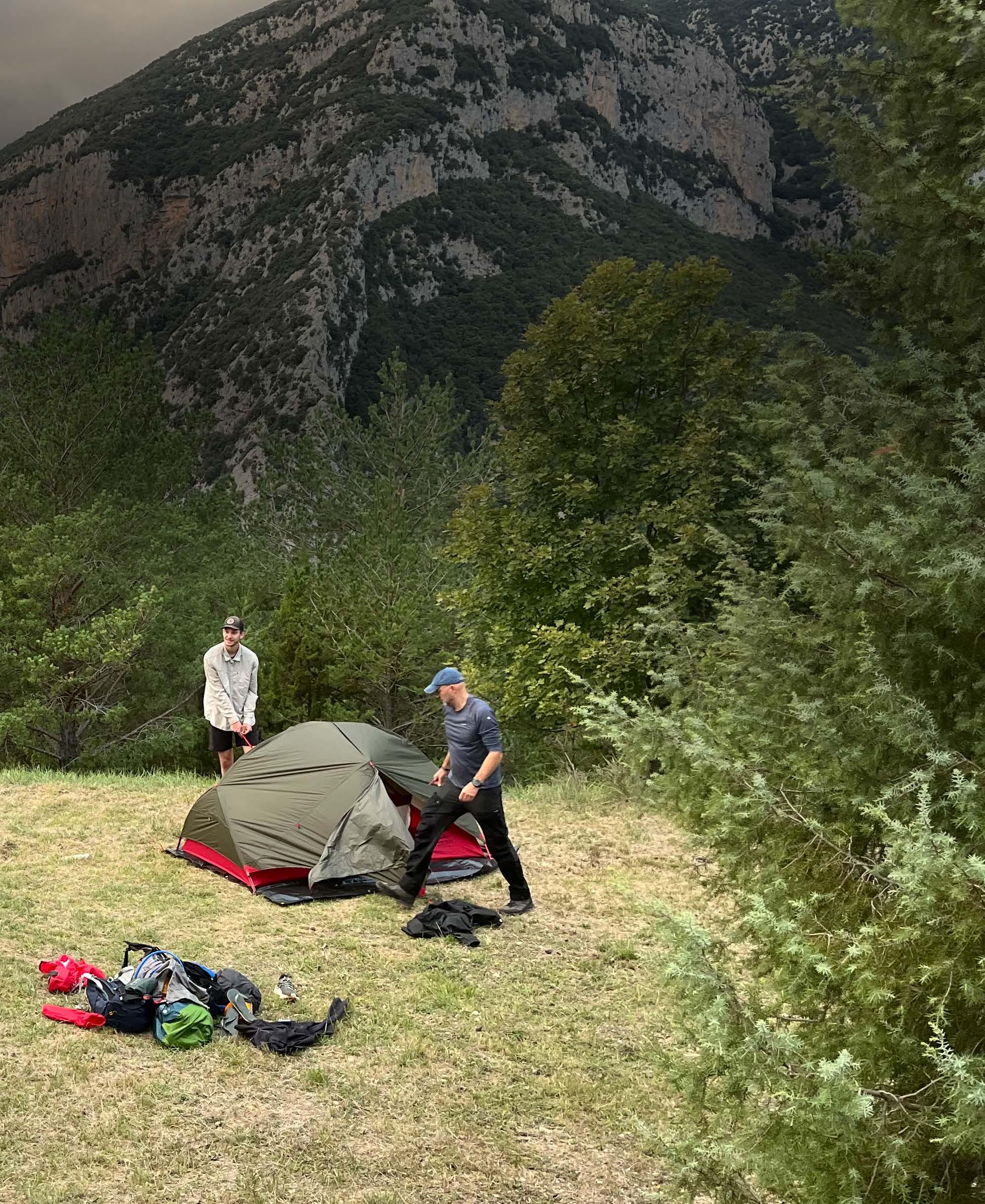 It’s late September in the Spanish Pyrenees, where crisp, chilly nights give way to quickly warming days. We’re settled in a spot overlooking endless mountain peaks and dense forests. I find myself wondering if anything lives here. There must be, because the mysterious calls of an owl kept us company throughout the night. Also, fresh droppings, possibly from a boar, have been found nearby.