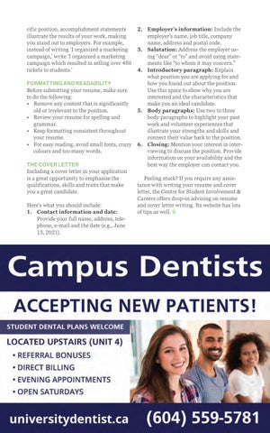 2. Employer’s information: Include the employer’s name, job title, company name, address and postal code. 3. Salutation: Address the employer using “dear” or “to” and avoid using statements like “to whom it may concern.” 4. Introductory paragraph: Explain what position you are applying for and how you found out about the position. Use this space to show why you are interested and the characteristics that make you an ideal candidate. 5. Body paragraphs: Use two to three body paragraphs to highlight your past work and volunteer experiences that illustrate your strengths and skills and connect their value back to the position. 6. Closing: Mention your interest in interviewing to discuss the position. Provide information on your availability and the best way the employer can contact you. Feeling stuck? If you require any assistance with writing your resume and cover letter, the Centre for Student Involvement & Careers offers drop-in advising on resume and cover letter writing. Its website has lots of tips as well. U