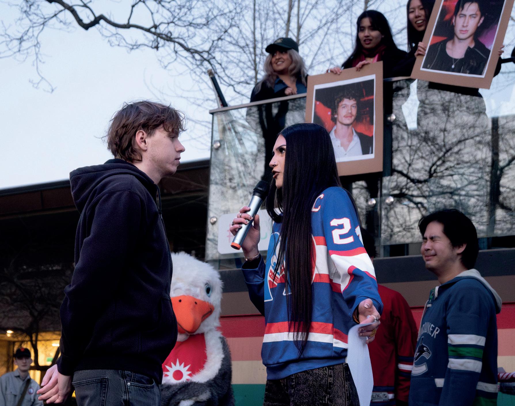 fish in their profile photos. Contestants went through additional long rounds of elimination of reciting character lines (the AMS Birb unfortunately failed this portion) and shooting a toy ball into a children’s hockey net. As the afternoon turned to evening, the moon began to rise, which got me daydreaming about Connor Storrie’s moons — I mean, have you seen that shower scene? It single-handedly made Rec North 69 per cent more busy. At the contest, I was not alone in my wishful thinking of a certain wasian prince showing up. Whispers filled the crowd as rumours about Hudson Williams being back in Vancouver passed from lip-to-lip. According to one random girl “he had nothing better to do.”