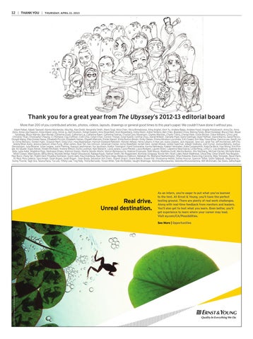 Thank you for a great year from The Ubyssey’s 2012-13 editorial board More than 200 of you contributed articles, photos, videos, layouts, drawings or general good times to this year’s paper. We couldn’t have done it without you. Adam Feibel, Adeeb Tawseef, Alanna Mackenzie, Alba Ng, Alex Dodd, Alexandra Smith, Alexis Sogl, Alice Chen, Alicia Binneboese, Alina Anghel, Alvin Yu, Andrew Bates, Andrew Hood, Angela Holubowich, Anna Ou, Anna Zoria, Anna-Lilja Dawson, Anne-Marie Long, Annie Ju, April Hudson, Arman Kazemi, Arno Rosenfeld, Aron Rosenberg, Arshy Mann, Astrid Tentorio, Ben Chen, Brandon Chow, Brenna Fynes, Brian Horstead, Bruce Chen, Bryan Sandberg, Bryce Warnes, Bryn Becker, Catherine Guan, Catherine Lai, Catherine Rawn, Catherine Salinas, Chantal Lyon Stevenson, Charles Menzies, Charlie Tilstra, Cheneil Hale, Chloe Bocker, Chloe Williams, Chris Lane, Christine Thian, Christopher Cheung, CJ Pentland, Clay Coffman, Colin Chia, Collyn Chan, Connor Thorpe, Coral Kasirer, Cynthia Chou, Daniel Millerd , Danielle Piper, Darryl Gallinger, Daryl Hofman, David Marino, David Penco, Donald Wang, Elba Gomez Navas, Elisabeth Piccolo, Elizabeth Hames, Elspeth Malcolm, Emilie Warren, Emily Burton-Brown, Emily Olesen, Emma Windsor-Liscombe, Erik Coates, Erin May, Faiza Mirza, Garricia Lee, Geoff Lister, Ginny Monaco, Gordon Katic, Grayson Reim, Greg Ursic, Haig Basmadjian, Hannah Goddard-Rebstein, Harveer Athwal, Henry Lebard, In Hye Lee, Ivana Litaveez, Jack Agopian, Jane Jun, Janet Tse, Jeff Aschkinasi, Jeff Cho, Jeremy Brian Avery, Jessica Dawson, Jillian Fung, Jillian James, Joan Tan, Joe Johnson, Johannah Cramer, Jonny Wakefield, Jordan Irwin, Jordan Mowat, Jordan Sawchuk, Joseph Ssettuba, Josh Curran, Joshua Beharry, Joshua Decolongon, Julia Browne, Julian Legere, Justin Fleming, Kaavya Lakshmanan, Kai Jacobson, Kaitlyn Tissington, Kamil Somaratne, Karina Palmitesta, Katelyn Verstraten, Katie Coopersmith, Katja De Bock, Kayi Wong, Kim Pringle, Kit Sauder, Kiyan Abhari, Kristen McEwen, Kristine Wilson, Kurtis Lockhart, Kyle Warwick, Laura Janara, Laura Pfeister, Laura Rodgers, Lauren Dixon, Lawrence Neal Garcia, Linda Peng, Linhui Li, Lisa Anderson, Ludmila Andréa, Lydia Adeli, Madeline Rigg, Maitrayee Dhaka, Mallorie Davies, Marilla Steuter-Martin, Marion Benkaiouche, Matisse Emanuele, Matt Meuse, Matthew Guité, Meriha Beaton, Mia Steinberg, Michael Oeckel, Michelle Mark, Micki Cowan, Mike Davies, Ming Wong, Mustafa Akhtar, Nassif Ghoussoub, Natalya Kautz, Nathan Smith, Nic Roggeveen, Nicholas Gorgopa, Nicole Yeh, Noah Lidell, Nolan Matthews, Olivia Etey, Omar Shariff, Paul Bogdan, Paul Bucci, Pavla Tan, Prabhi Deol, Priyanka Hariharan, Quinn Aebi, Raul Arambula, Raul Pacheco-Vega, Rebecca Clarkson, Rebekah Ho, Reyhana Heatherington, Rhys Edwards, Riana Ang-Canning, Riley Tomasek, Ripan Hans, RJ Reid, Rory Gattens, Sara Amadi, Sarah Bigam, Sarah Bigam , Sean Brady, Sebastian Yoh Chern, Shandi Shiach, Shane Belbin, Sharan Rai, Shoshanna Hereld, Sidney Hryciuk, Spencer Toffoli, Sruthi Tadepalli, Stephanie Xu, Sunny Thorne, Tagh Sira, Tarana Rana, Tia Low, Tiffany Law, Ting Kelly, Trisha Bernardo, Tristan Miller, Tyler McRobbie, Vaughn Brakhage, Veronika Bondarenko, Veronika Khvorostukhina, Will McDonald, Zac Davis, Zafira Rajan