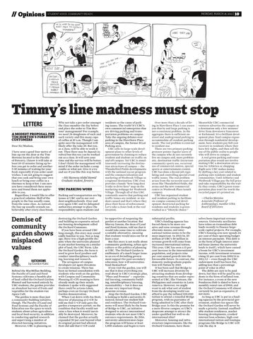 selves been important revenue sources. University auxiliaries have taken on tremendous debt loads recently to finance largescale capital projects. For example, UBC’s housing arm now spends 24 per cent of their operating budget on interest payments. This debt is in the form of high-interest internal loans (money the university lends to itself), which have caused a boom for UBC’s investment income, with investment revenues rising 32 per cent from 2010/11 to 2011/12 — even though the UBC endowment itself has been flat, adding less than a percentage point of value in 2012. The debts are sure to be paid down, but they will be paid by students in the form of inflated rent. For instance, a room at the new Ponderosa Hub is slated to have a monthly rental rate of $900, and the Orchard Commons will almost certainly be just as expensive, if not more. As long as UBC is put in a funding squeeze by the provincial government, student-run spaces like the Orchard Garden will never be made a priority. Instead, unaffordable student residences, market housing developments, crooked internal loan schemes, high-cost international tuition and boutique programs like Bridge to UBC will rule the day. U
