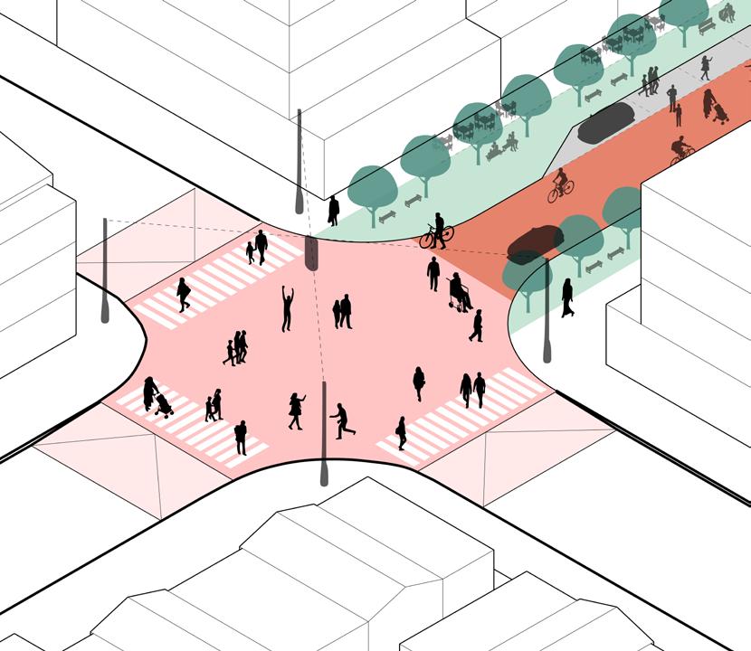 Tactical urbanism can be applied strategically throughout the site to improve pedestrian safety and increase the vibrancy of the public realm.