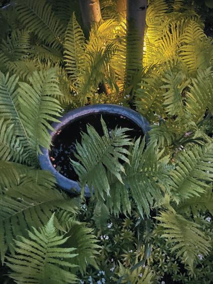 A simple bird bowl, resting at grade and quietly nestled among soft drifts of ferns and galium, offering a gentle moment of pause in our Studio garden. |