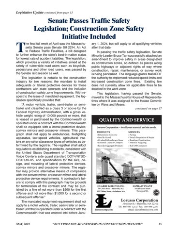 ary 1, 2024, but will apply to all qualifying vehicles after that date. In passing the traffic safety legislation, Senate Minority Leader Bruce Tarr successfully attached an amendment to improve safety in areas designated as construction zones, so-defined as places along public highways or adjacent rights of way where construction, repair, maintenance, or survey work is being performed. The language grants MassDOT the authority to implement reduced speed limits and increased construction zone fines. Existing law does not currently allow for applicable fines to be doubled in the work zone. This legislation, having passed the Senate, moved to the Massachusetts House of Representatives where it was assigned to the House Committee on Ways and Means. continued on page 17