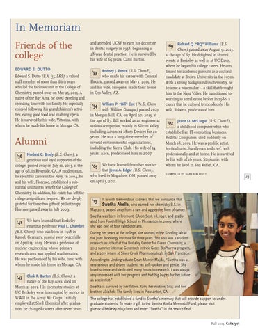 Swetha was born in Fremont, CA on Sept. 18, 1991, and graduated from Foothill High School in Pleasanton in 2009, where she was one of four valedictorians. During her years at the college, she worked in the Keasling lab at the Joint Bioenergy Institute for three years. She also was a student research assistant at the Berkeley Center for Green Chemistry, a 2012 summer intern at Genentech in their Green BioPharma program, and a 2013 intern at Silver Creek Pharmaceuticals in San Francisco. According to Undergraduate Dean Marcin Majda, “Swetha was a very serious and driven student, yet soft-spoken and gentle. She loved science and dedicated many hours to research. I was always very impressed with her progress and had big hopes for her future as a scientist.” Swetha is survived by her father, Ram; her mother, Sita; and her brother, Abishek. The family lives in Pleasanton, CA. The college has established a fund in Swetha’s memory that will provide support to undergraduate students. To make a gift to the Swetha Akella Memorial Fund, please visit givetocal.berkeley.edu/chem and enter “Swetha” in the search field. Fall 2013 Catalyst