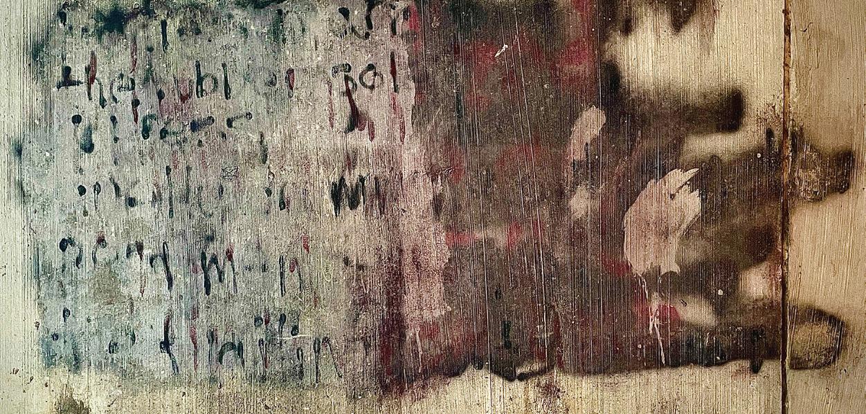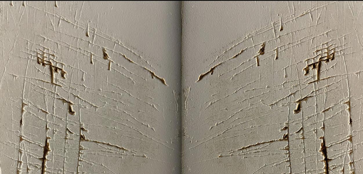 explores what I consider to be “found” asemic texts. Asemic writing is a form of gestural mark-making that appears to be language but intentionally lacks semantic meaning. Also within this grouping of photographs are images of blank signage and message boards, faux ancient tablets, and other curious oddities of vaporized and disabled language.