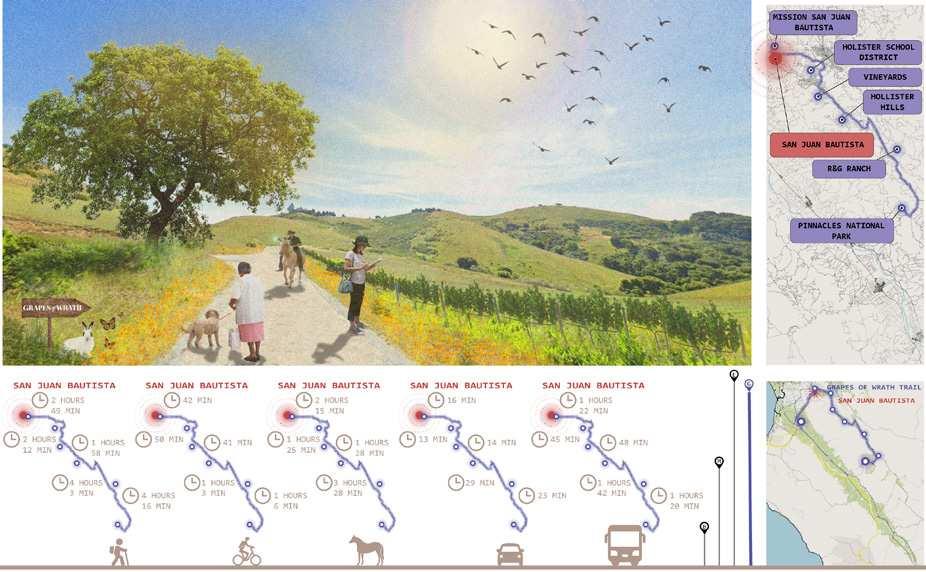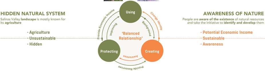 part of the world systems comprising globalization, the “worlding” of the Valley is now expanding to new sectors. The recent upgrade of Pinnacles National Park (previously classified only as a National Monument) combined with the ongoing plans to create a National Heritage Area around the Monterey Bay Area, along with local efforts for territorial branding, may soon connect the Valley to regional and global tourist flows. While these dynamics offer rich economic opportunities, they also present tensions; the Salinas Valley is not immune from the problems affecting California at large, including a housing crisis, homelessness, conflicts across racial and class lines, and even risk of epidemics and pathogen outbreaks (e.g. escherichia coli in lettuce). Whether or not these changes will happen, what forms they will take, and who will benefit from them, is yet to be determined. Our studio sought to intervene in this state of transition, deploying design tools to catalyze forces already in place, test unexpected synergies, and advance new visions for the Salinas Valley and its inhabitants.