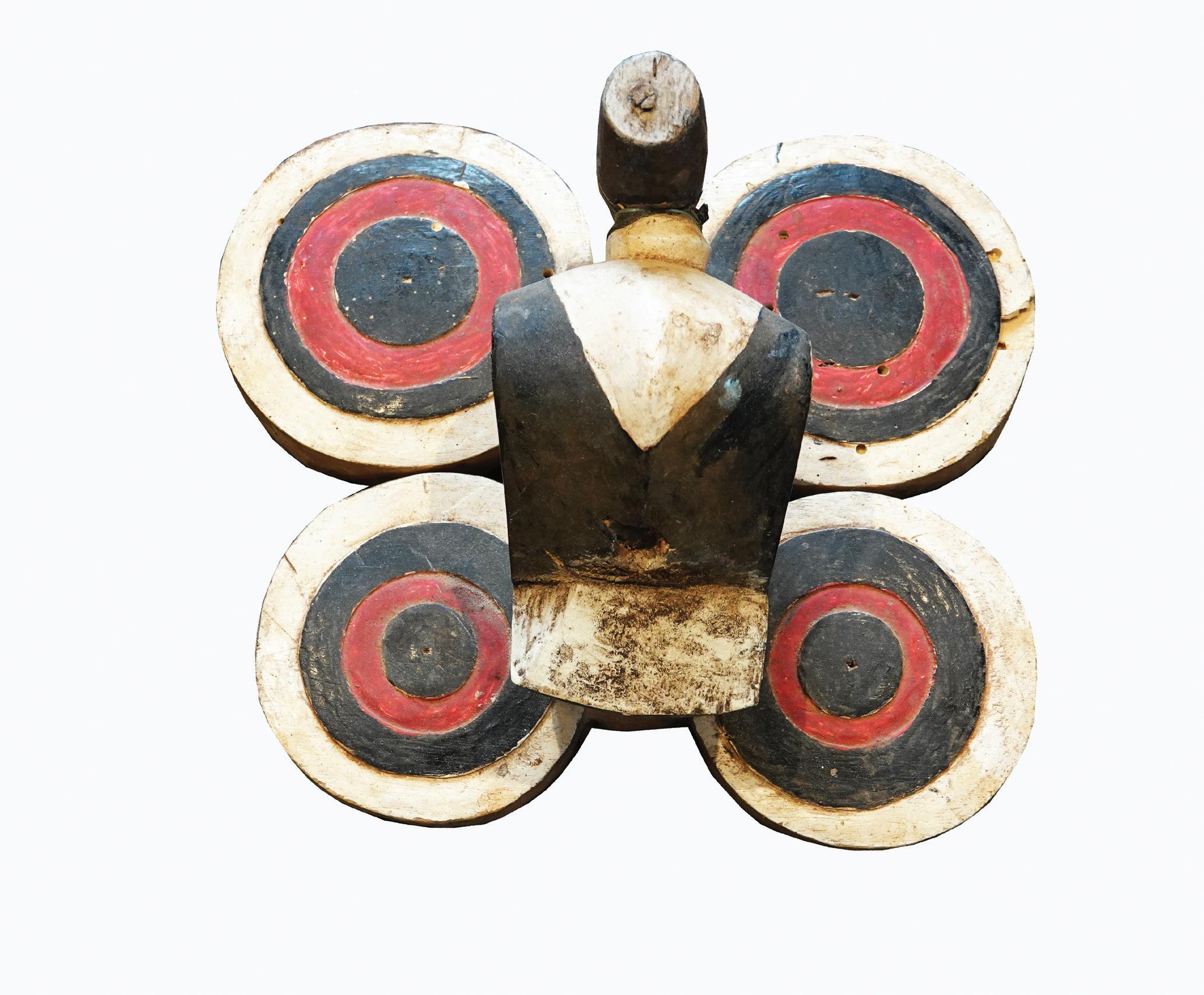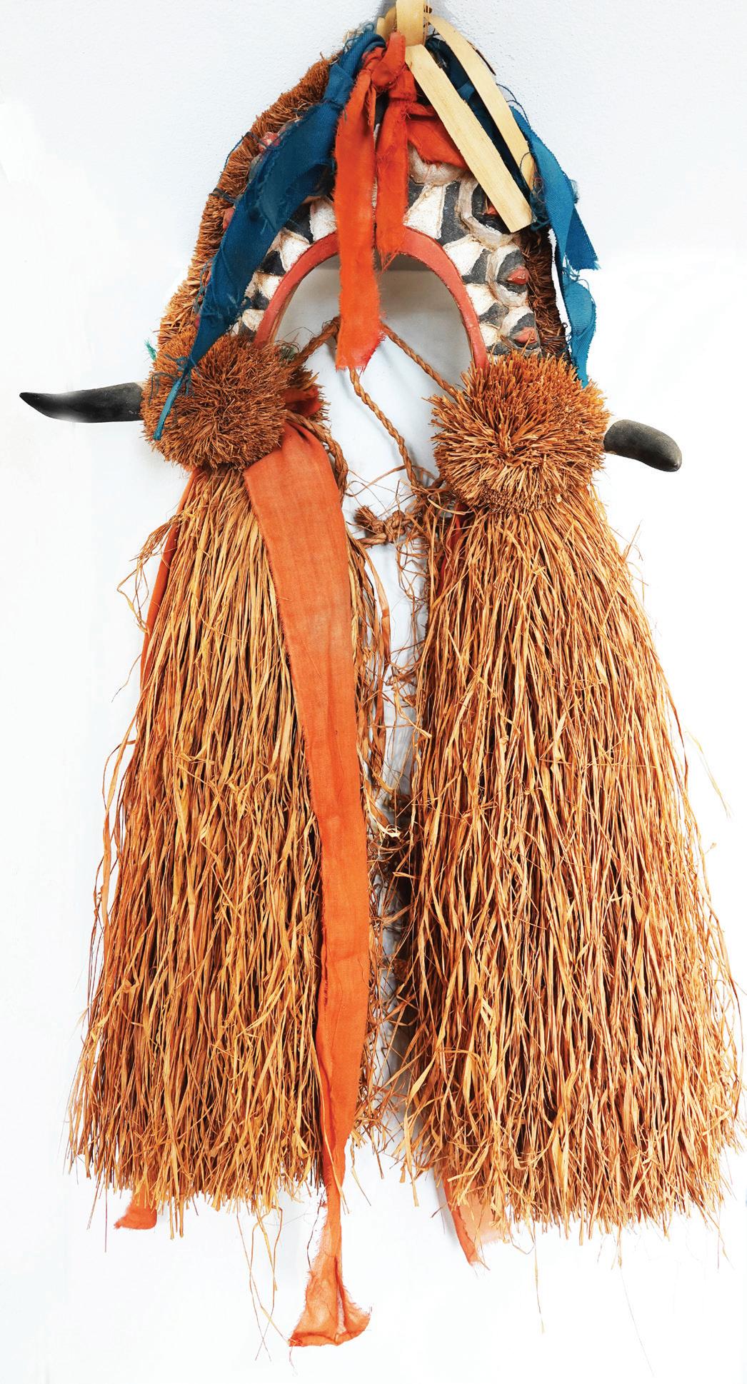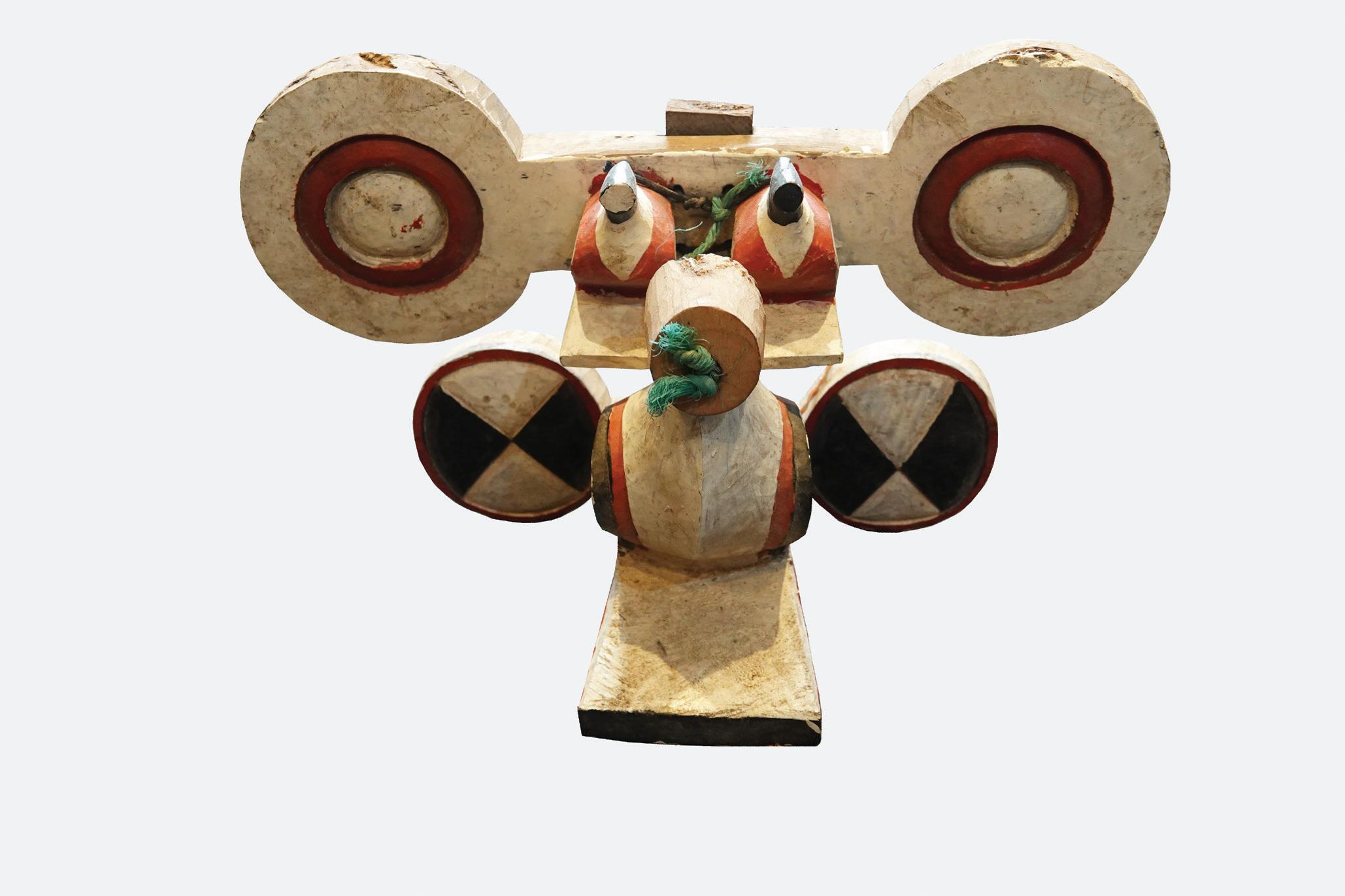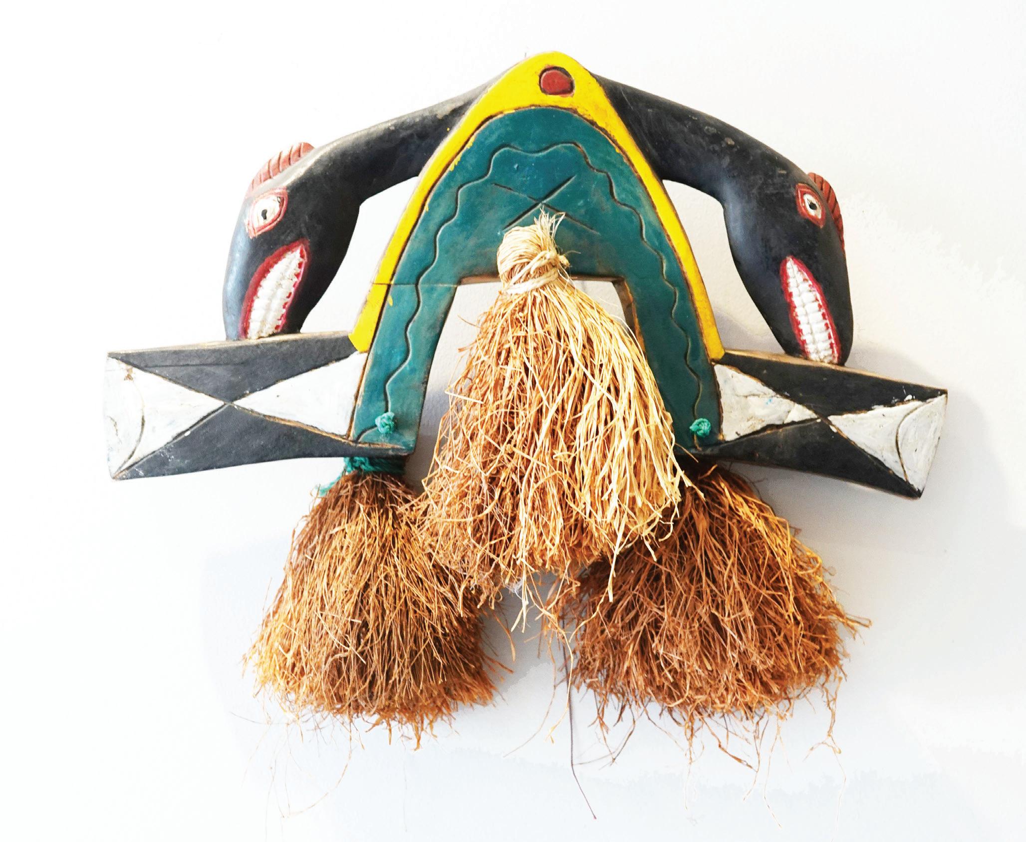 Representações semelhantes, de madeira, mas mais pequenas e desprovidas de pescoço constituem ainda máscaras, usadas sobre a cabeça, associadas a ráfias e entrançados de fibras vegetais.