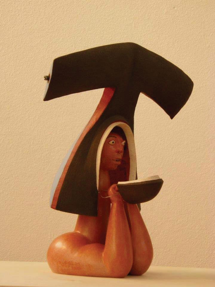 mado em recetáculo aberto, ou em forma de altar, revestido de tecido, onde se depositam oferendas e fazem libações. Esculturas antigas foram valorizadas através da incisão de zonas escurecidas pelo fogo e da aplicação de elementos de cobre ou latão, não raro nos olhos.