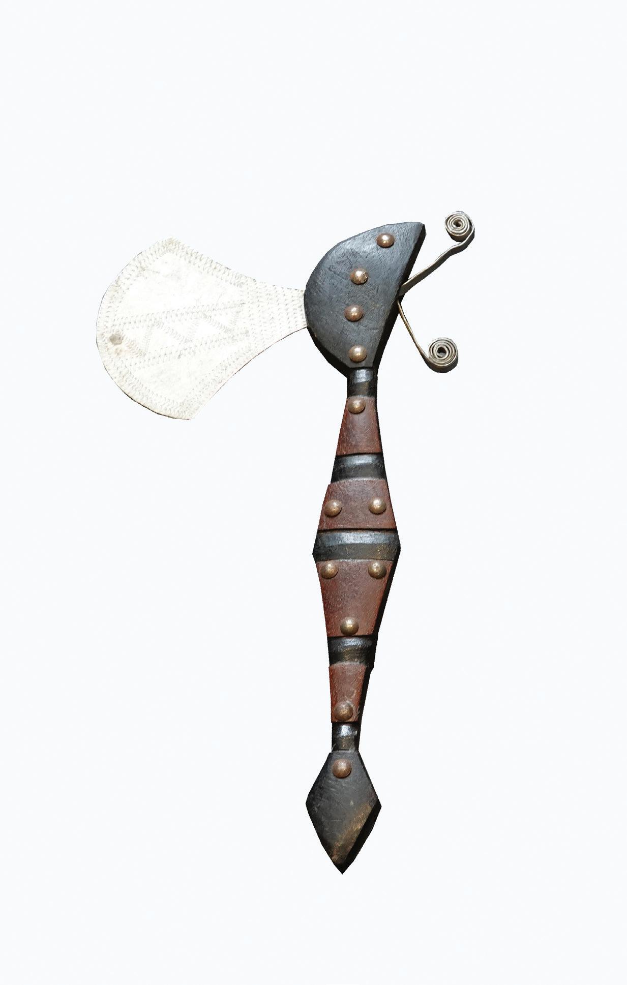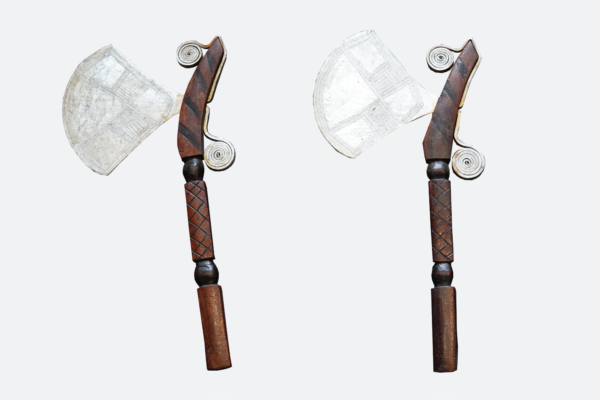 Além de bastões de madeira exibindo figuras antropomórficas femininas, usados pelas mulheres durante danças fúnebres, os homens utilizavam machados de aparato, símbolos de realeza, também mostrados em rituais de iniciação e fúnebres, com lâmina de ferro e cujos cabos representam mulheres, rodeadas por elementos anulares, mostrando outros apenas cheios e motivos geométricos, existindo ainda exemplares onde se observam, em relevo, figuras zoomórficas (crocodilos).