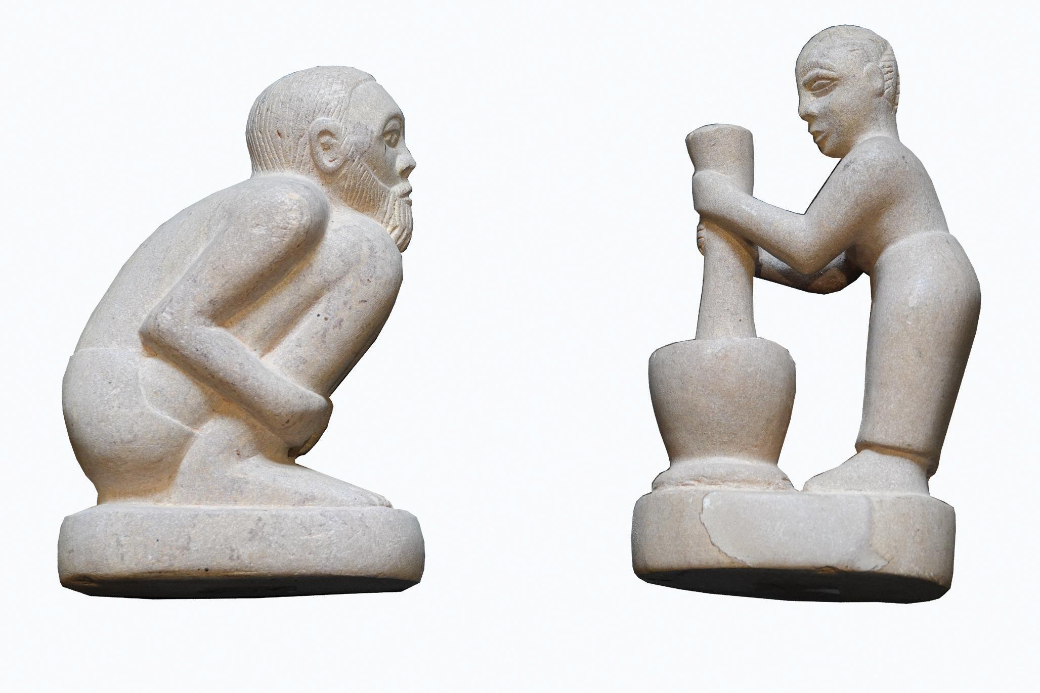Pertencem aos artefactos capazes de identificarem estatutos sociais elevados, usados quotidianamente, durante cerimónias ou nos santuários, os bancos, com típico assento arqueado, suportado por uma ou mais colunas, com ele solidárias, e com base circular. Em alguns, raros, a coluna central foi substituída por figura zoomórfica (hipopótamo, boi) ou humana, enquanto as laterais, quando existem, podem apresentar sugestões de pernas femininas ou forma antropomórfica. Registam-se bancos com assento plano, de contorno circular, suportado por figuras, um deles por uma mulher com os braços erguidos, montada em bovídeo.