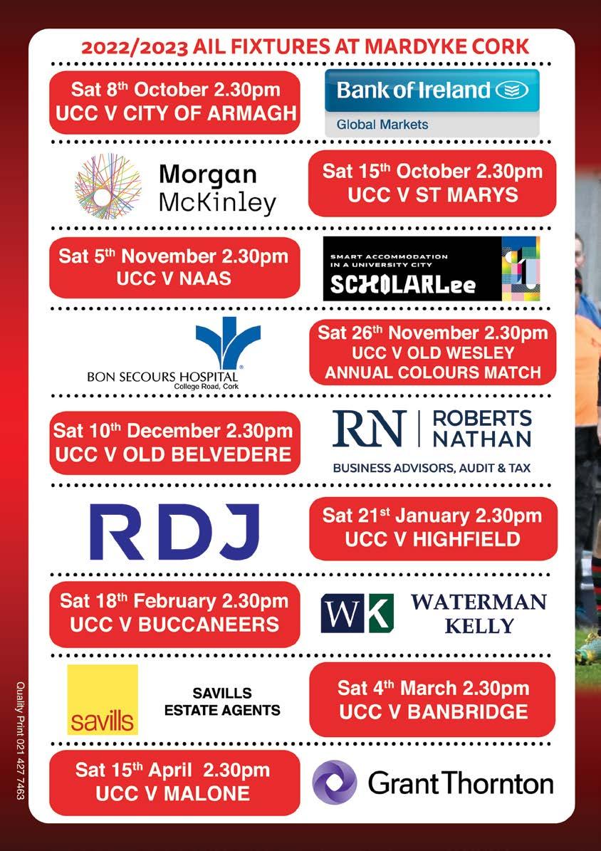 Today we welcome our friends and neighbours Highfield RFC to the Mardyke for our first home match of 2023. Highfield have been paying well recently, having beaten UCC before Christmas, and then went on to beat St. Marys both home and away. They are now 4th in the league table. I would like to wish Highfield and their President, Frank Cooper well for the rest of the season. I hope we have a great game of rugby today and while I wish for a UCC win, I know we can all return to the clubhouse and enjoy the hospitality after the match.