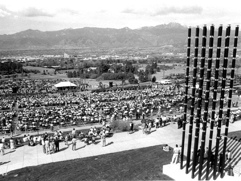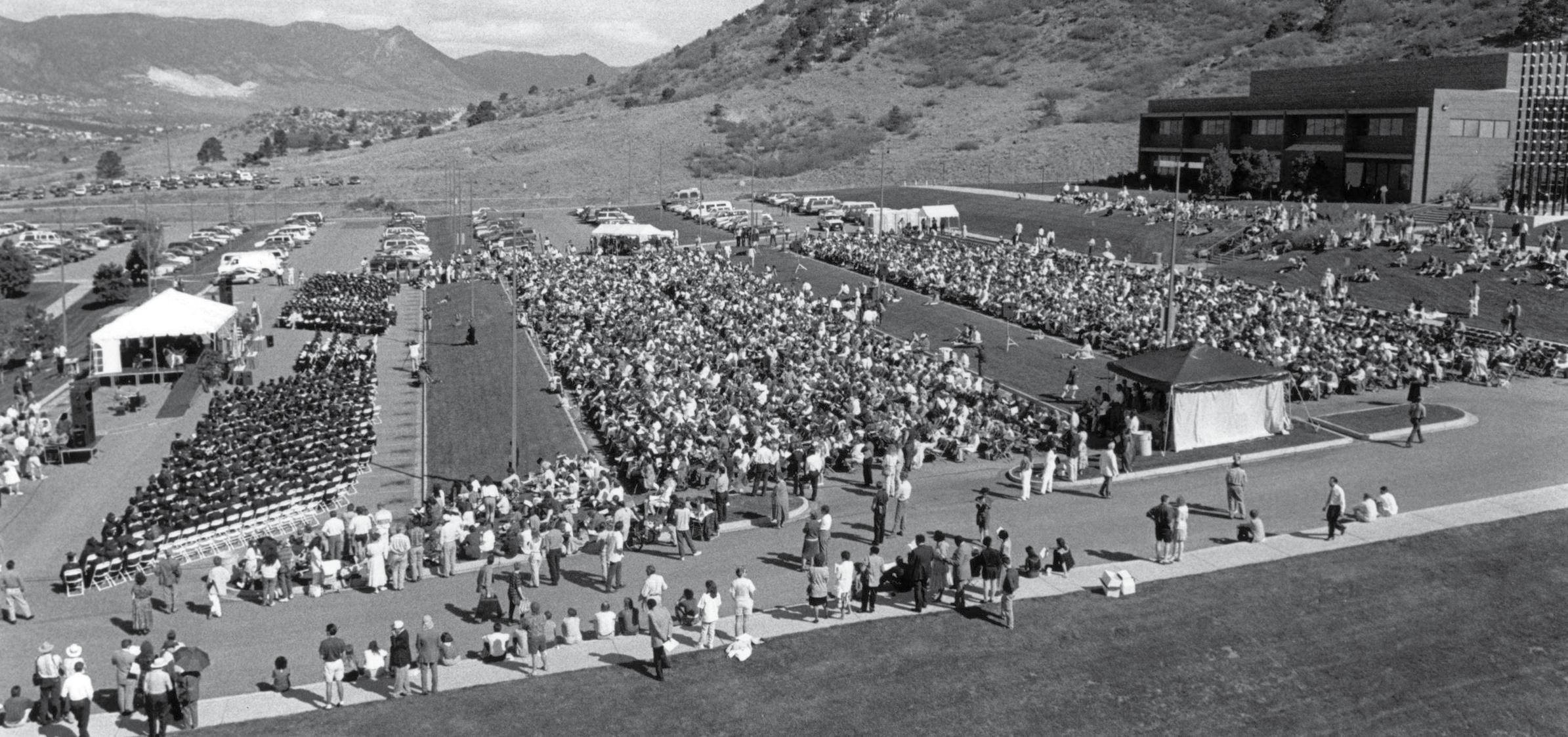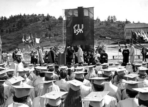 Until 1977, UCCS graduates marched in CU Boulder’s Commencement. UCCS held its first official Commencement at the BROADMOOR International Center on May 17, 1977. Later ceremonies moved to the original BROADMOOR World Arena.