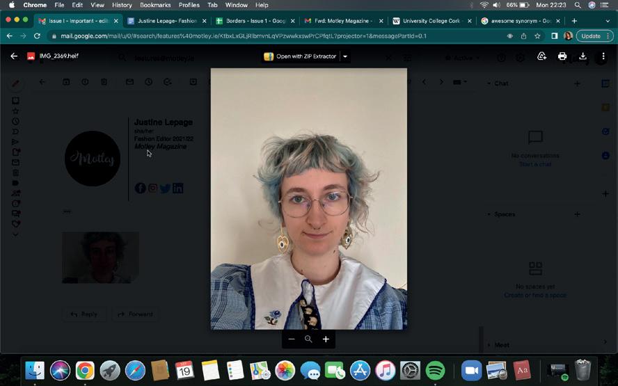 This publication is made from 100% recycled paper. Motley welcomes letters from readers, emailed to editor@motley.ie. Motley is published by Motley Magazine, The Hub, UCC, Western Road, Cork. Printed by City Print Limited, Victoria Cross, Cork. Copyright 2022 Motley Magazine. All rights reserved. Reproduction in whole or in part without written permission is strictly prohibited. All efforts have been made to ensure that details and pricing are correct at time of print. Motley magazine does not take responsibility for any errors incurred. This magazine can be recycled either in your green bin kerbside collection or at a local recycling point.