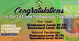 First time takers from Elementary level got 97.14% against the national percentage of 40.76%, while 80.00% for Secondary Level against the national percentage of 46.94%.