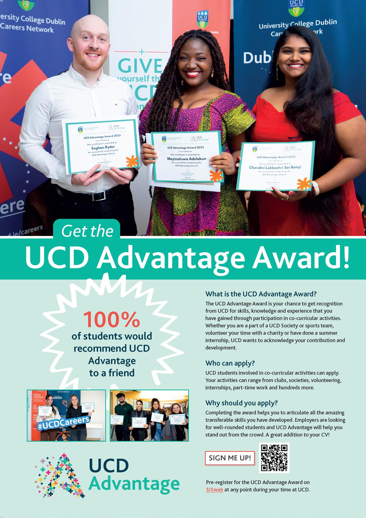 Whether you are a part of a UCD Society or sports team, volunteer your time with a charity or have done a Summer internship, UCD wants to acknowledge your contribution and development. For more information visit www.ucd.ie/careers/advantage