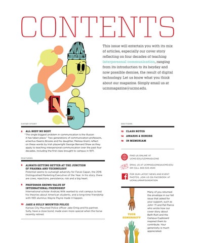 CONTENTS This issue will entertain you with its mix of articles, especially our cover story reflecting on four decades of teaching interpersonal communication, ranging from its introduction to its heyday and now possible demise, the result of digital technology. Let us know what you think about our magazine. Simply email us at ucmmagazine@ucmo.edu.