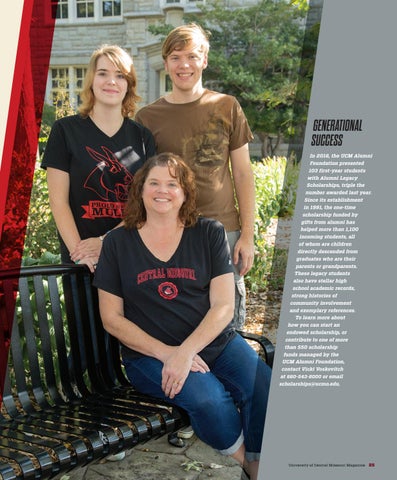 GENERATIONAL SUCCESS In 2016, the UCM Alumni Foundation presented 103 first-year students with Alumni Legacy Scholarships, triple the number awarded last year. Since its establishment in 1991, the one-time scholarship funded by gifts from alumni has helped more than 1,100 incoming students, all of whom are children directly descended from graduates who are their parents or grandparents. These legacy students also have stellar high school academic records, strong histories of community involvement and exemplary references. To learn more about how you can start an endowed scholarship, or contribute to one of more than 550 scholarship funds managed by the UCM Alumni Foundation, contact Vicki Voskovitch at 660-543-8000 or email scholarships@ucmo.edu.