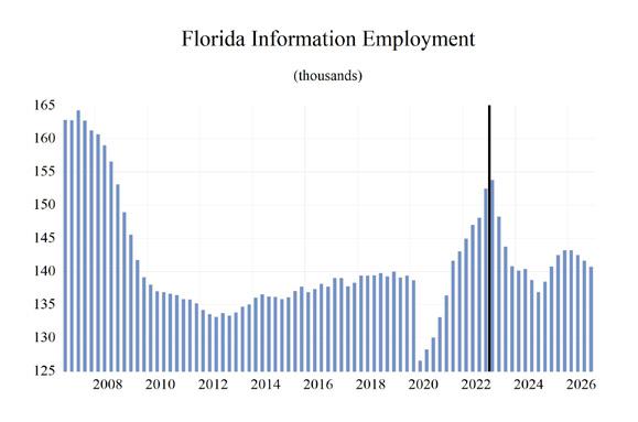 The Information sector is a mix of high-tech ventures, including computer programming and software development, but job growth in this sector has long been weighed down by traditional media, which has been decimated by structural and technological changes in the gathering and disseminating of information, and most importantly, who pays for it. Sources of growth within this sector in Florida, such as software development, data processing and hosting, wireless telecommunications, and content creation have offset the slowing but still lingering loss of jobs in traditional media and publishing. Job growth was flat in 2019, -6.1% in 2020, but recovered to 5.9% in 2021, and hit 7.1% in 2022—boosted by the continued roll-out of 5G wireless services. The slowing economy will impact job growth as it will decelerate to 0.5% in 2023, then further to -0.1% in 2024, before rebounding to 2.1% in 2025, and then contracting by 1.1% in 2026. The projected growth path implies an average growth rate of 0.3% during 2023-2026.