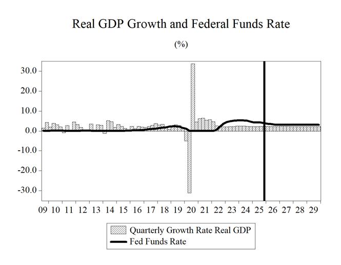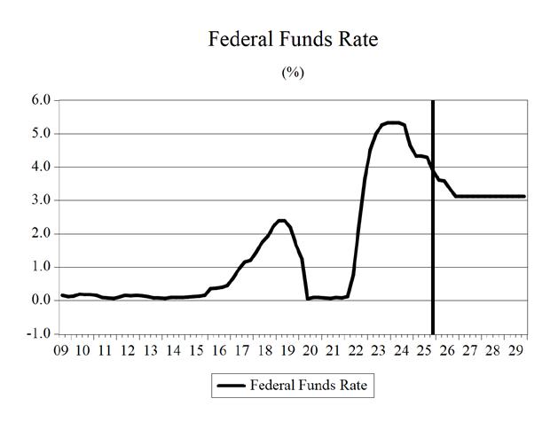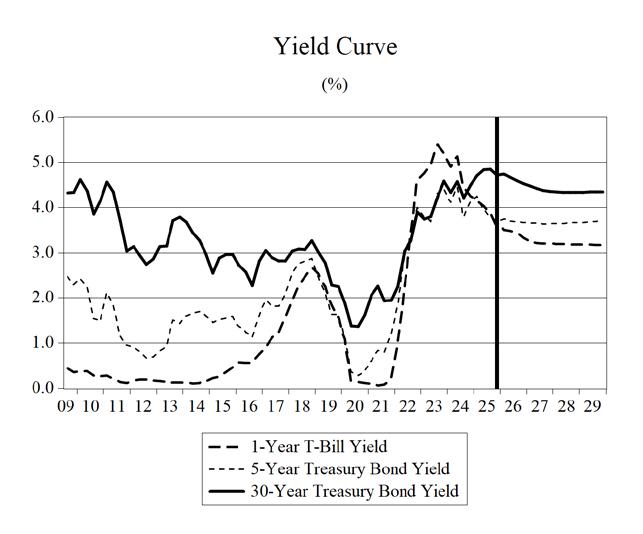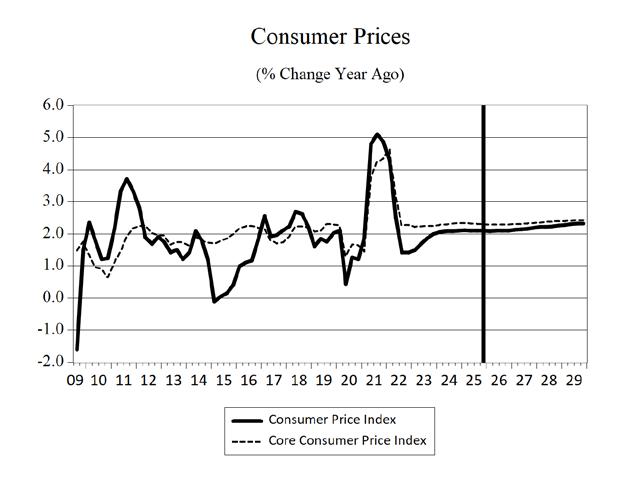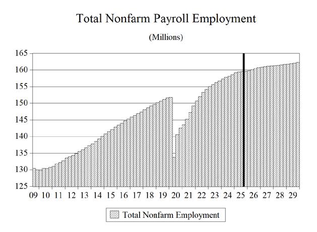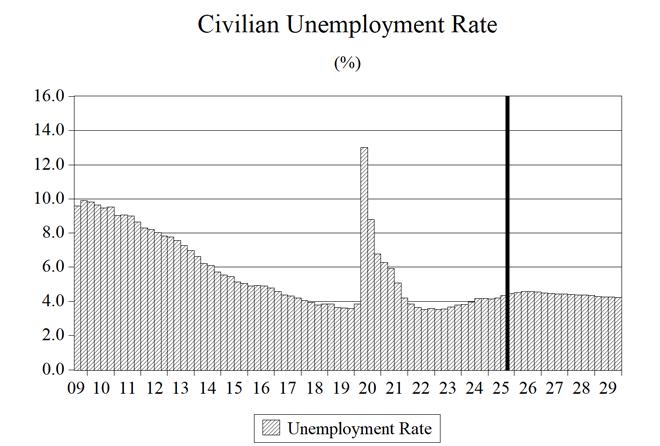 The slower GDP growth in 2025 and beyond will impact the labor market. The unemployment rate will gradually rise into 2026, before stabilizing around 4.4% through 2029. Job growth will slow to a trickle as the economy essentially remains at full employment.