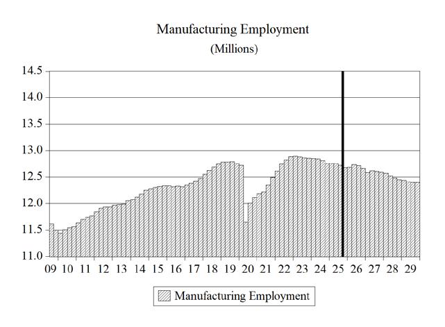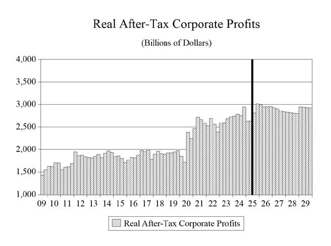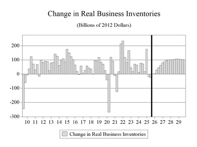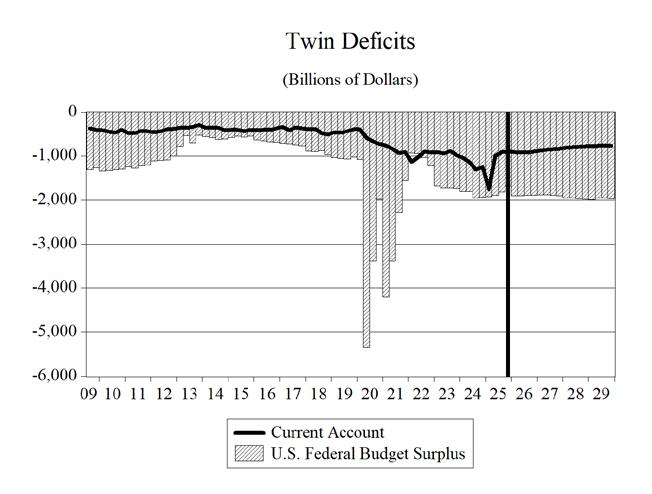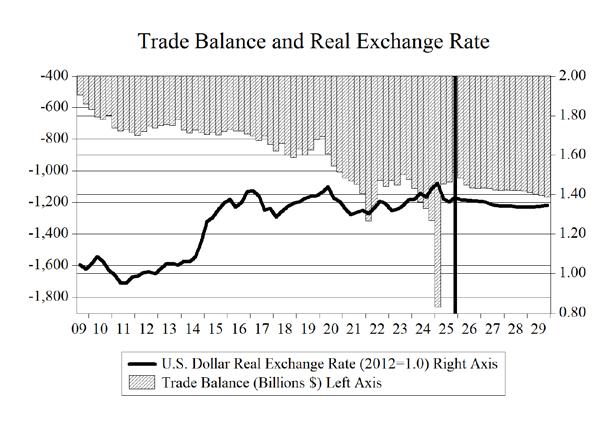 Real net exports will average over -$1.49 trillion during 2026-2029, with the trade balance improving somewhat in 2026 in response to tariffs even after the Supreme Court ruling, before worsening to -$1.61 trillion in 2029.