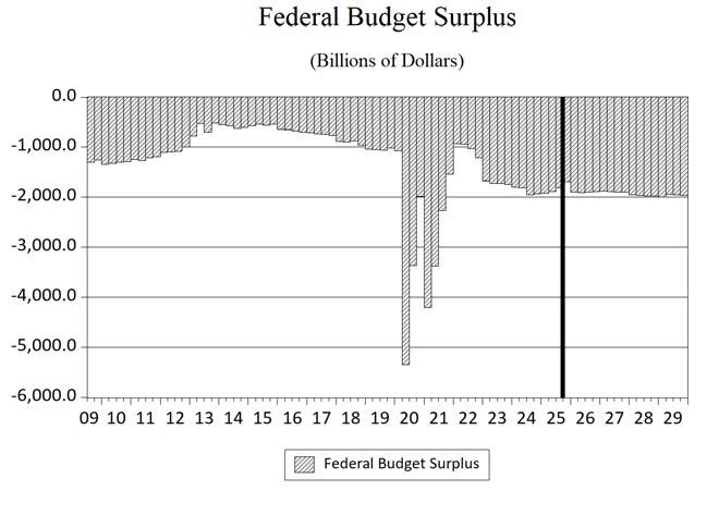 I am doubtful that Congress will undertake the required cuts to the deficit soon, and the Big, Beautiful Bill turned law suggests further delay in addressing this issue. Thus, we are still projecting deficits through 2029 that will consistently average over $1.9 trillion. The amount that the projected deficits will add to the national debt over the next four years will be $7.7 trillion, pushing the total national debt to more than $46 trillion and a debtto-GDP ratio of approximately 128%. If higher interest rates return to the economy, the burden of servicing this debt will continue to rise as well. Slower-than-projected economic growth or a recession would also push projected deficits higher, though the possibility of faster-than-projected economic growth and interest rate cuts could help mitigate the growth of these deficits on the debtto-GDP ratio.