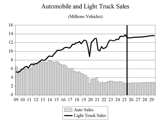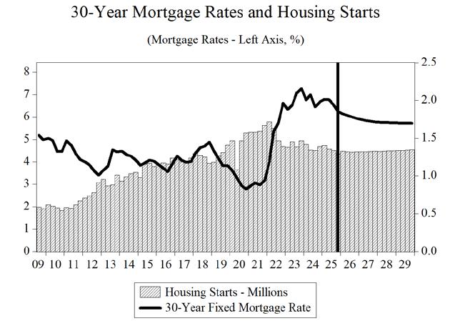We expect housing starts to stabilize after a slow deceleration that commenced in 2023 and continued through 2024. After reaching 1.6 million in 2021, starts fell to 1.37 million in 2024 and 1.35 million in 2025. They will continue to hover in a narrow range for the next four years, coming in at a level slightly more than 1.34 million in 2029. High home prices and a slowing economy are headwinds, and the expected decline in mortgage rates as the Federal Reserve initially loosened monetary policy did not materialize, as long-term interest rates moved in the opposite direction. But additional cuts should cause mortgage rates to drift somewhat lower. The ongoing shortage of housing in many parts of the country will help fight against these headwinds and provide support for home building, albeit at this slightly slower pace.